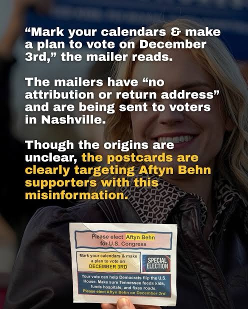 - In Tennessee’s 7th Congressional District, voters have reported receiving anonymous mailers and flyers that list the wrong date for an upcoming special election, telling people to vote the day after Election Day.